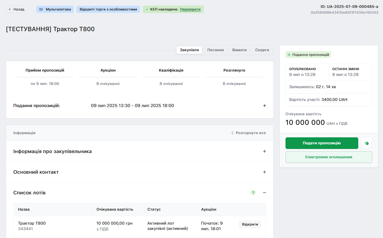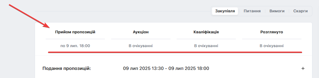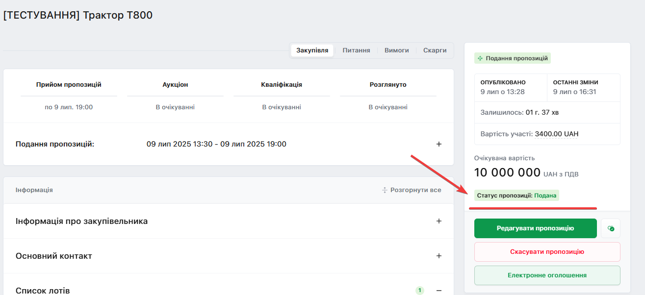 На сторінці закупівлі буде інформація стосовно статусу пропозиції: