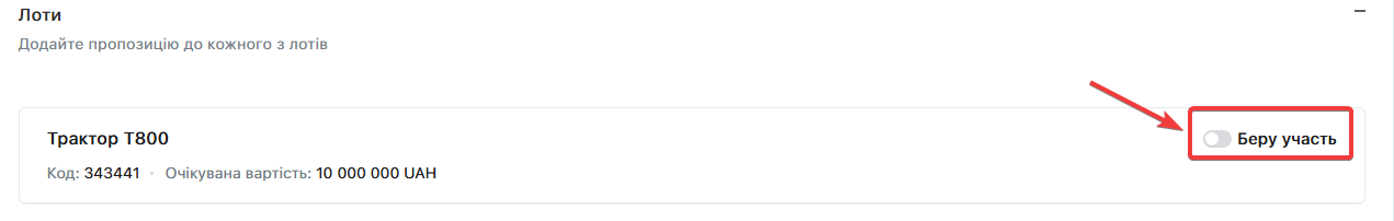 Додайте пропозицію до «Лоту (Лотів)» у відповідному полі, для цього натисніть на чекбокс «Беру участь», щоб розкрити цінову пропозицію конкретного «Лоту»: