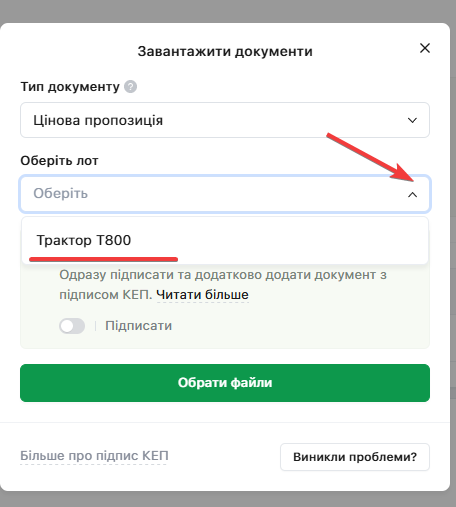 Якщо документи пропозиції відносяться до різних «Лотів» закупівлі, належність до певного «Лоту» можна обрати за допомогою спадного меню: