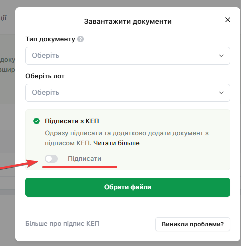 Якщо «Замовник» вимагає, щоб кожен документ був підписаний «КЕП», натисніть на чекбокс «Підписати з КЕП» (за замовчуванням не активований):