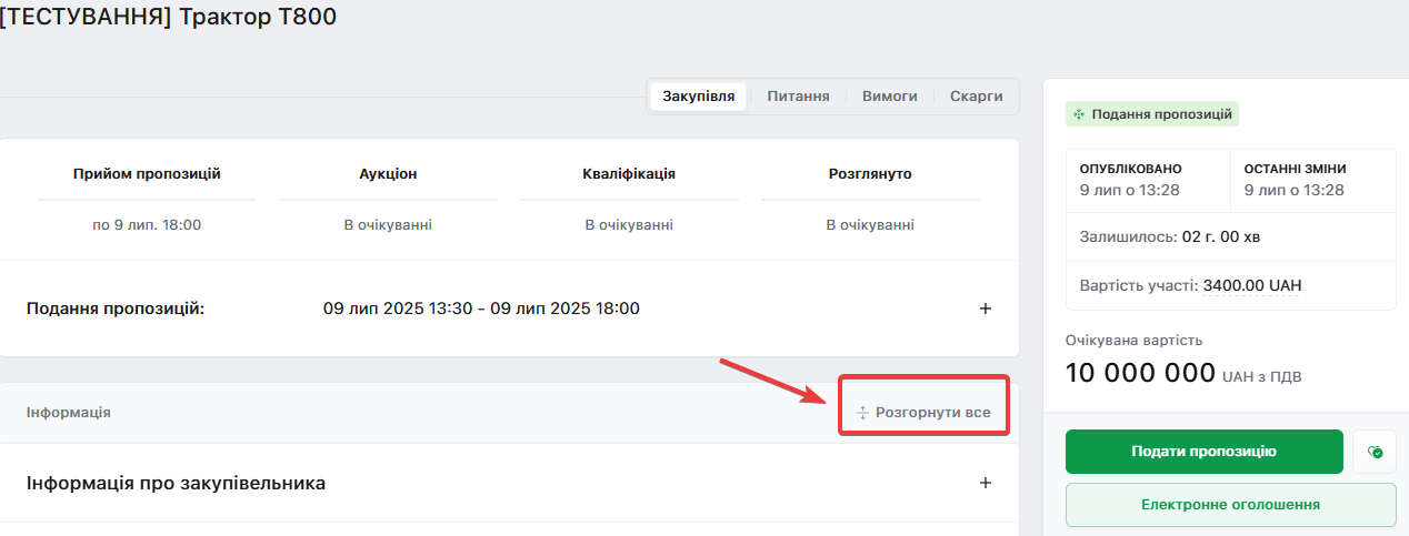 Розгорнуту детальну інформацію про закупівлю можна побачити натиснувши кнопку «Розгорнути все»: