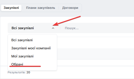 Після додавання закупівлі в обрані, її можна відшукати обравши пункт «Обрані» в спадному меню, біля поля пошуку: