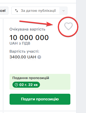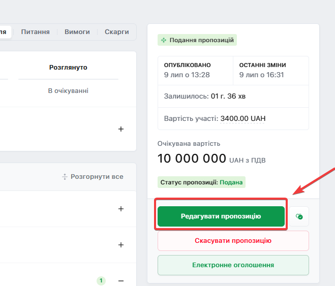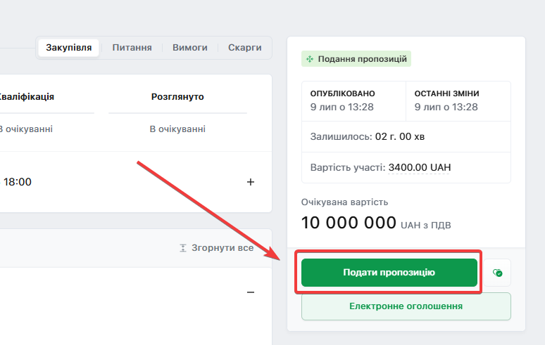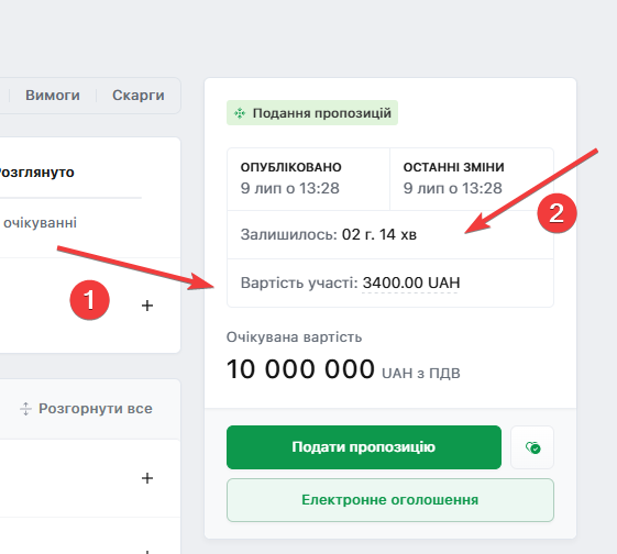 Зверніть увагу на вартість участі в «Поданні пропозиції (1)» та «Строки подання пропозиції (2)»: