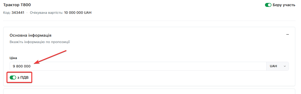 Зверніть увагу, чекбокс з ПДВ автоматично активований, так як «Замовник» активував ознаку ПДВ при оголошенні закупівлі. «Постачальник» не може змінювати цей параметр
