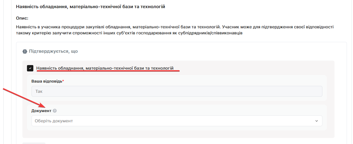 Після відповідей на вимоги до кваліфікації учасників, натисніть на галочку, щоб підтвердити відсутність підстав для відмови в участі у процедурі закупівлі: