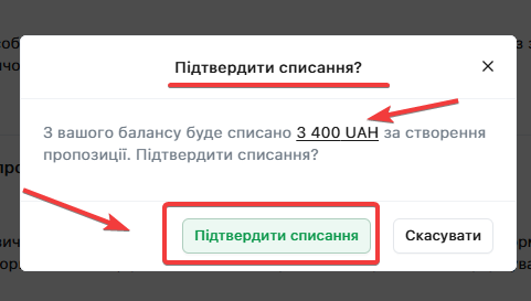 Підтвердіть списання грошей з балансового рахунку за участь в закупівлі, натиснувши кнопку «Підтвердити списання»: