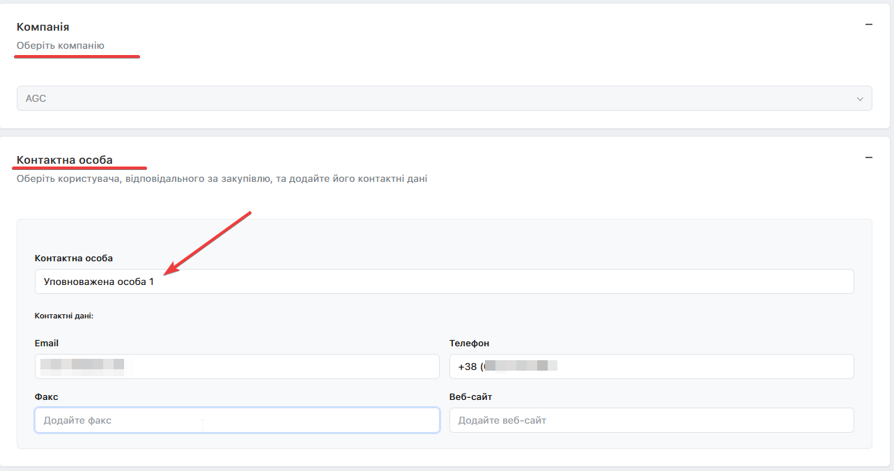 💡Інформація про компанію та контактну особу підтягується автоматично із особистого кабінету, за потреби її можна редагувати у відповідному полі: