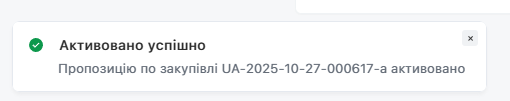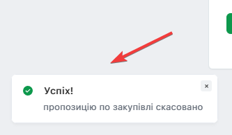 Система проінформує про успішне скасування Пропозиції відповідним повідомленням, яке зʼявиться ліворуч внизу сторінки: