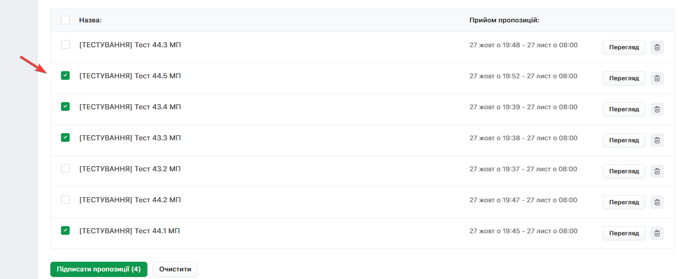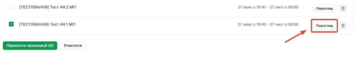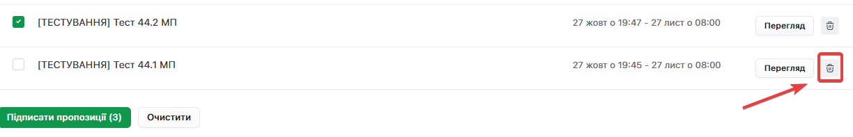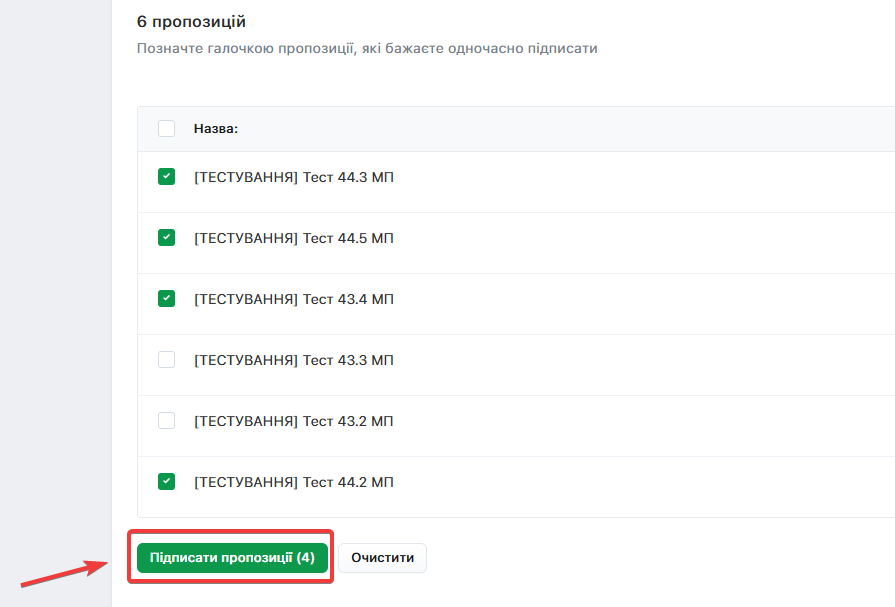 Якщо бажаєте відмінити вибір конкретної Пропозиції для підпису - натисніть на відмітку ще раз. Кнопка Очистити повністю деактивує всі відмітки одразу.