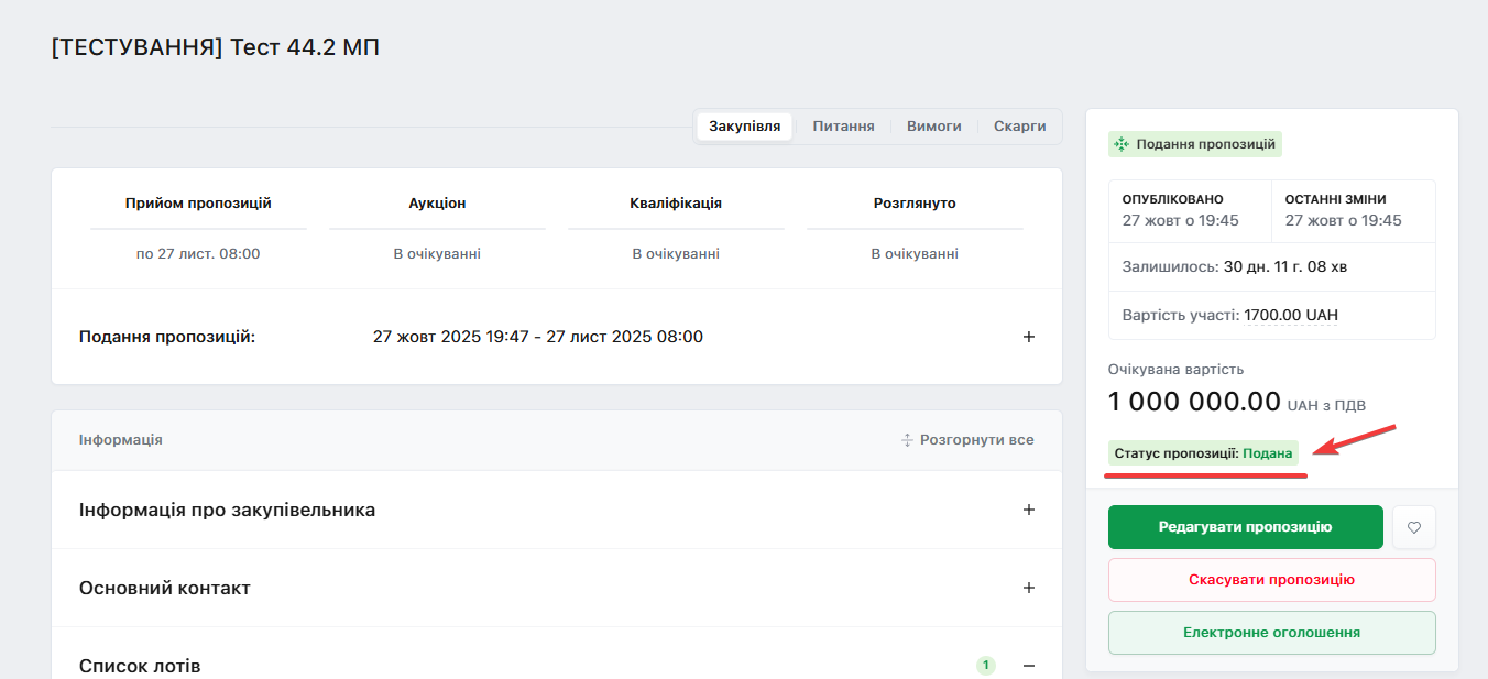 На головній сторінці майданчику, можна побачити статус Пропозиції - Подана:
