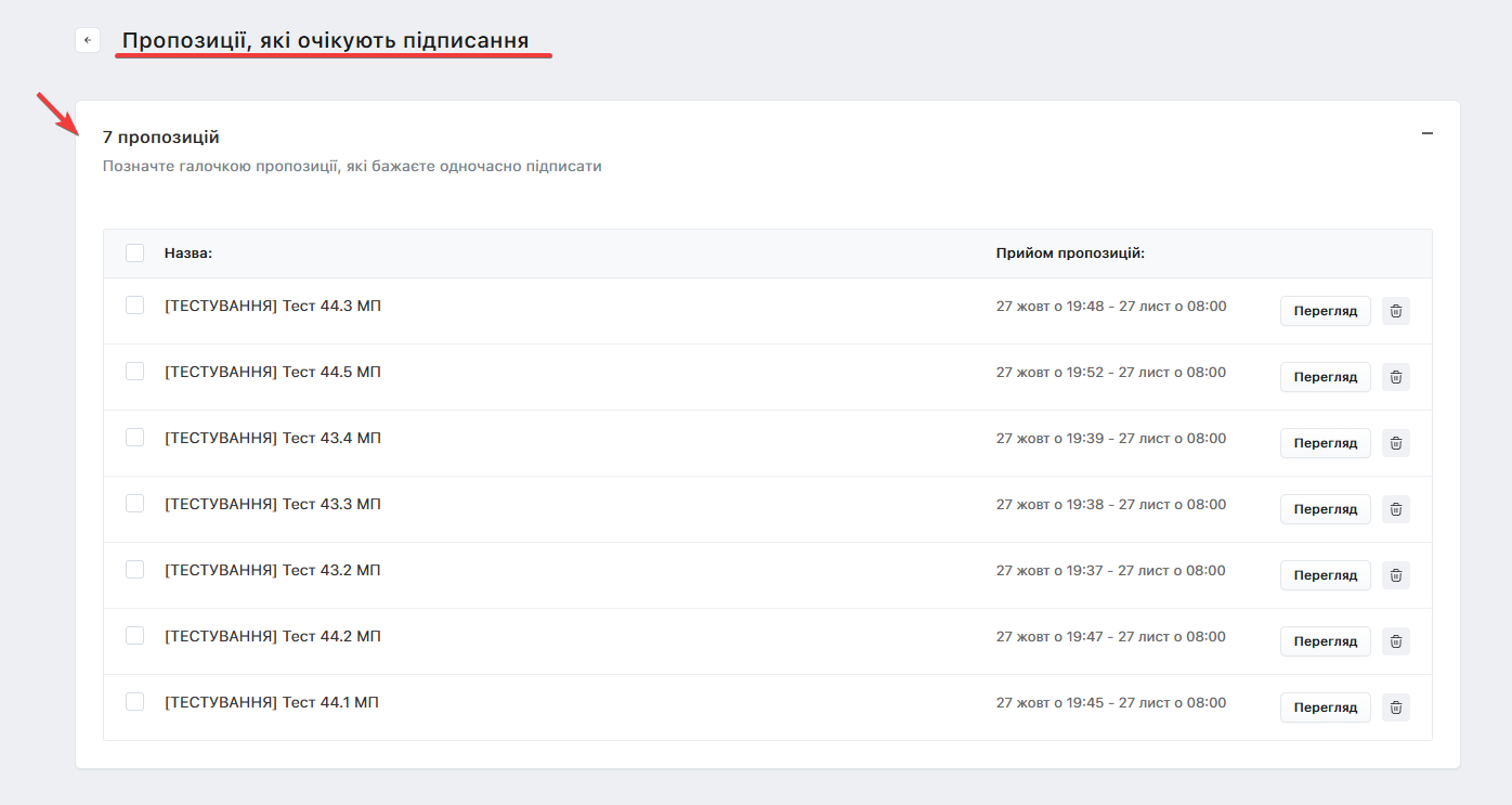 Оберіть одну, або декілька Пропозицій, які бажаєте підписати проставляючи відповідні відмітки навпроти Пропозиції: