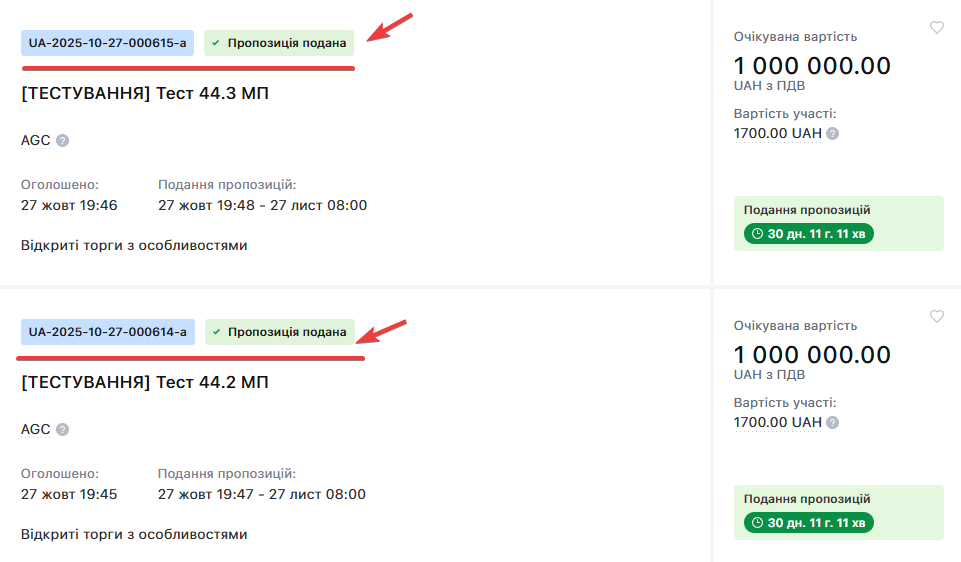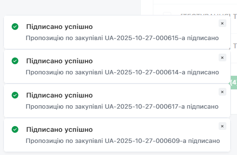 В разі успішного підписання Пропозицій, система проінформує це відповідними повідомленнями, які відобразяться в лівому нижньому куті сторінки:
