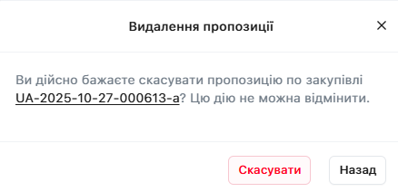 УВАГА! Після натискання система попередить про скасування пропозиції. Пропозиція буде видалена без можливості відновлення