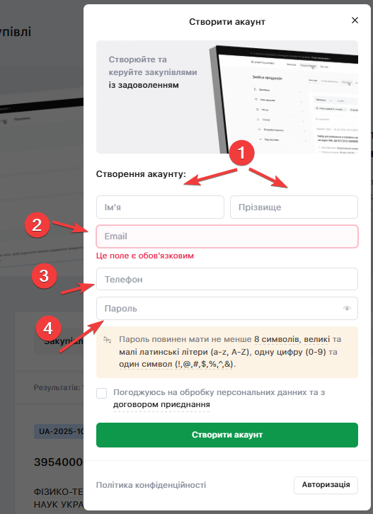 1. Активуйте позначку про погодження на обробку персональних даних та з договором приєднання.