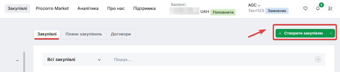 Відкрийте головну сторінку майданчику, та натисніть кнопку Створити закупівлю: