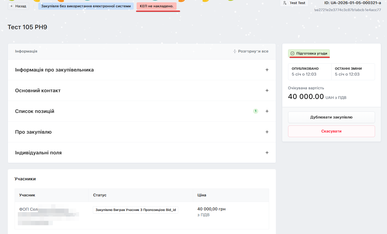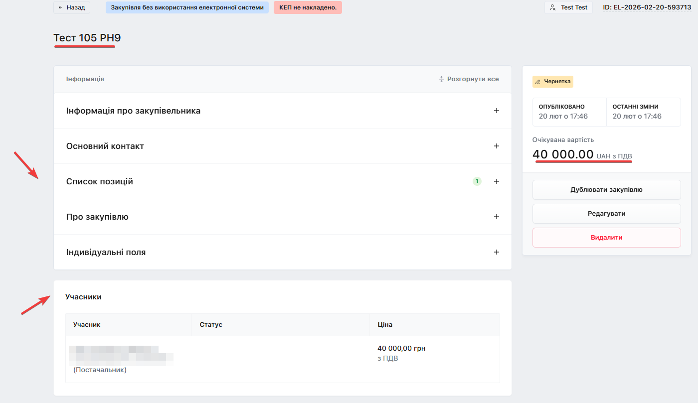 Система автоматично перенаправить на картку Закупівлі, де можна перевірити всю ключову інформацію (переможець, очікувана вартість, список позицій, тощо) перед публікацією Закупівлі: