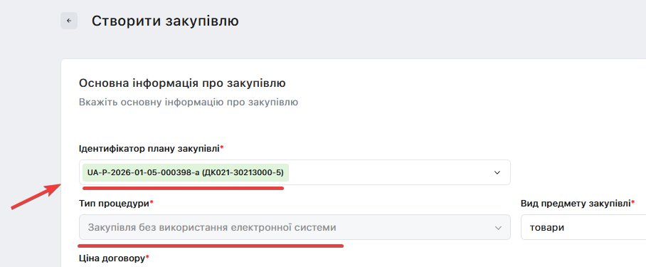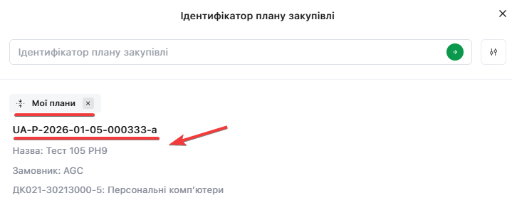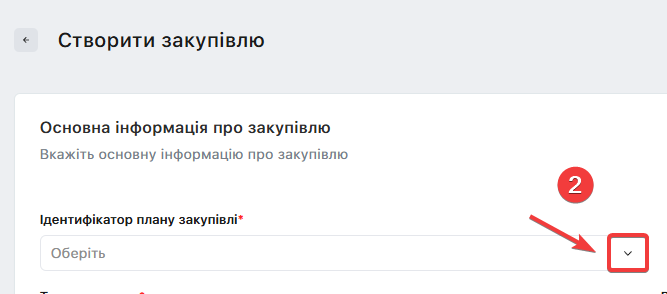Необхідно обрати відповідний План закупівлі в полі Ідентифікатор плану закупівлі: