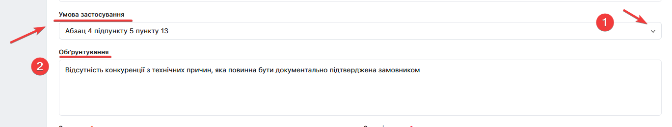 В полі Умова застосування (1) - вибрати зі спадного меню одну з підстав для оголошення закупівлі. В полі Обґрунтування (2) - система автоматично переносить опис підстави, а за потреби - уповноважена особа додає власний текстовий опис обґрунтування.