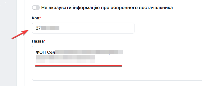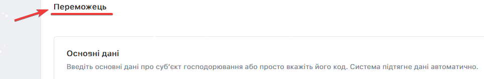 Назва Переможця і ключова інформація підтягуються автоматично після введення коректного коду ЄДРПОУ/ІПН: