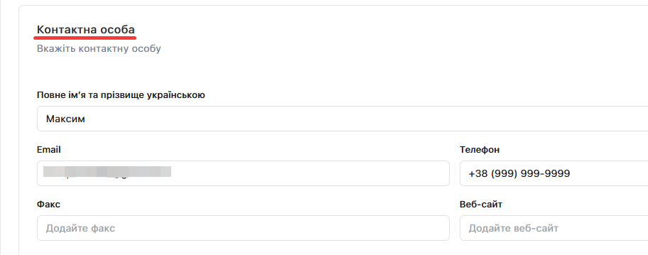 Перевірте інформацію щодо контактної особи (за замовчуванням підтягується із особистого кабінету):
