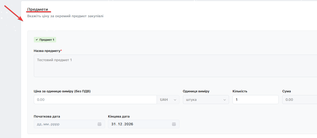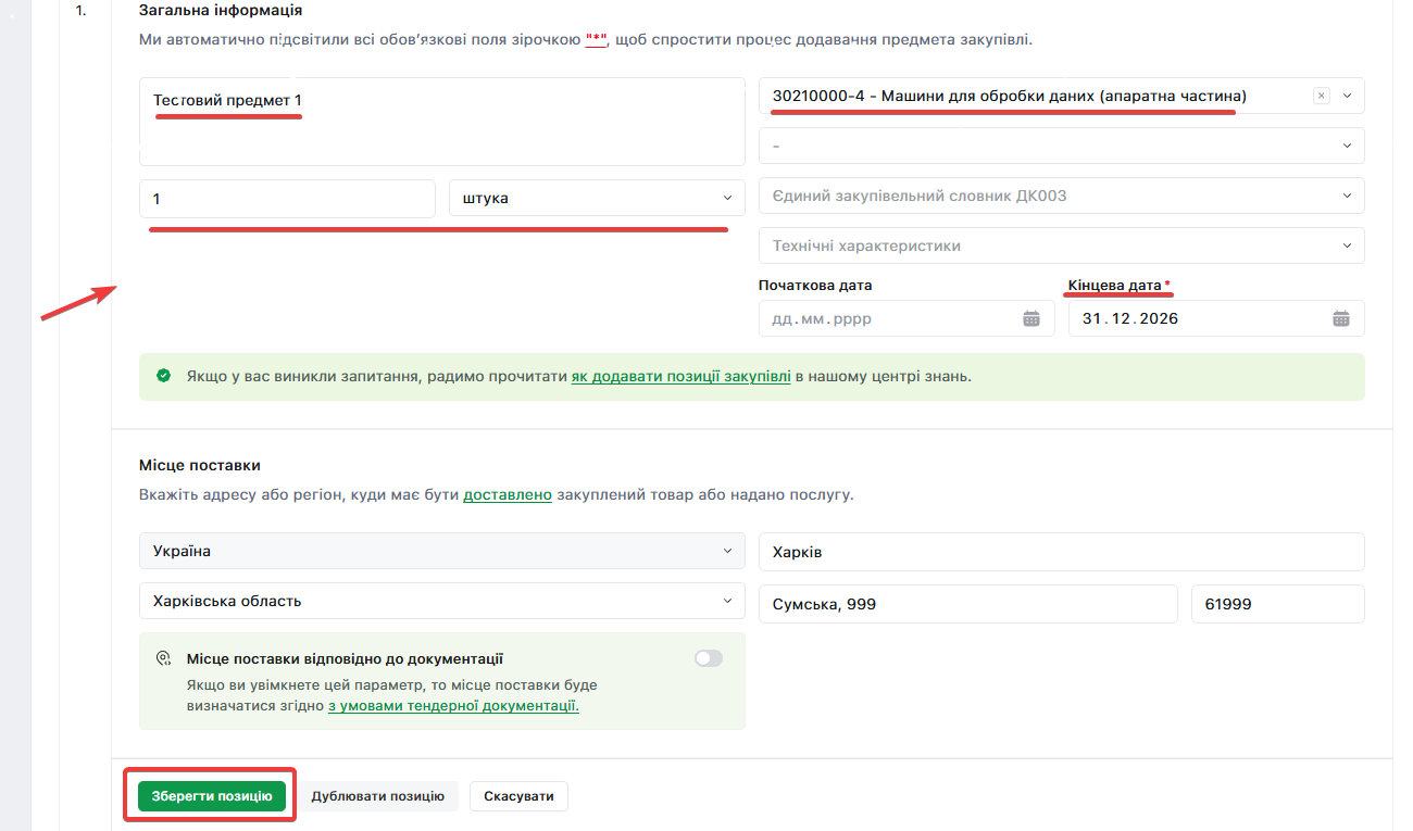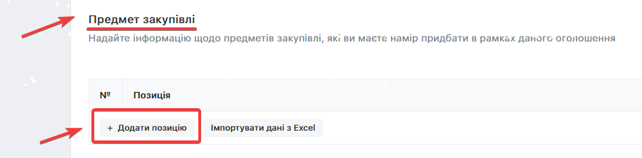 Додайте Предмет закупівлі натиснувши кнопку Додати позицію: