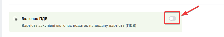 Зверніть увагу! Показник ПДВ - увімкнений за замовчуванням (чекбокс підсвічується зеленим кольором)