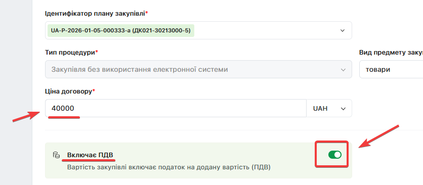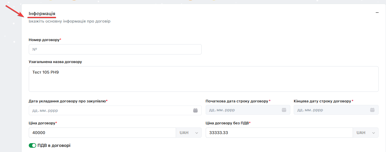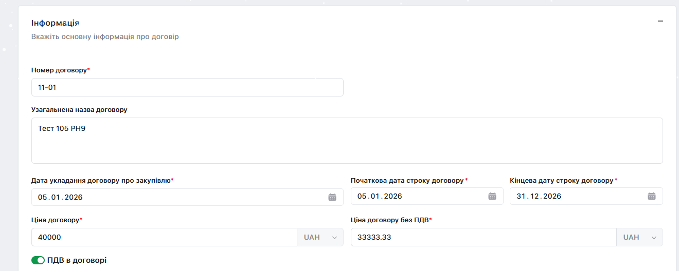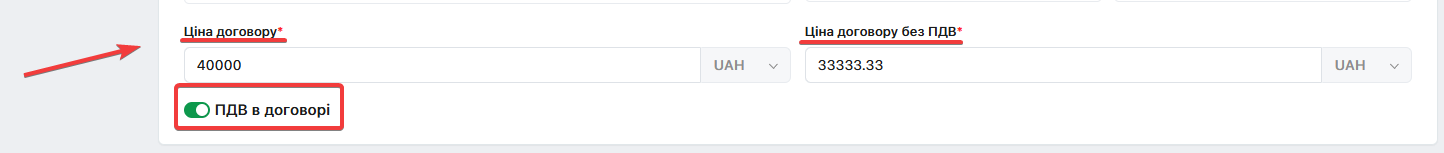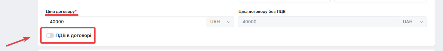 УВАГА! Ретельно перевірте Інформацію про Ціну договору (з ПДВ/без ПДВ). Показник ПДВ в договорі за замовчуванням увімкнений.