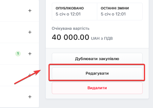 Для того щоб підписати закупівлю натисніть кнопку Редагувати:
