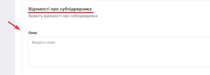 За потреби вкажіть інформацію про субпідрядника у відповідному полі Опис: