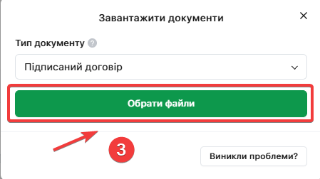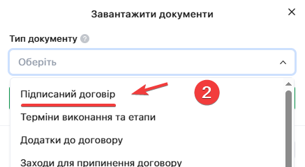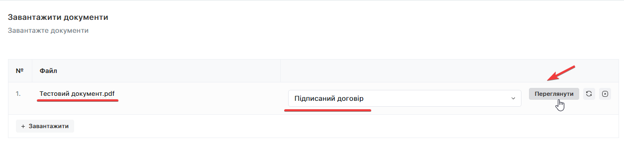 Завантажте Підписаний договір та інші документи (за потреби) у відповідному розділі, натиснувши кнопку Завантажити: