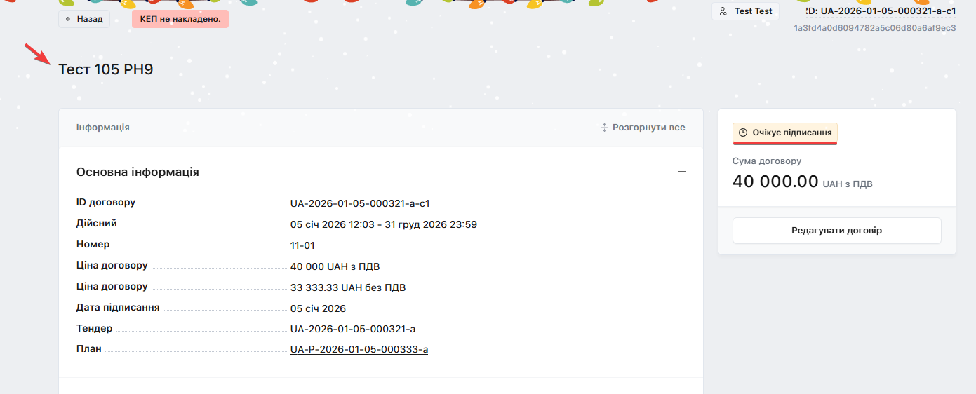 Договір буде збережено як чернетку зі статусом Очікує підписання, його можна перевірити в картці договору: