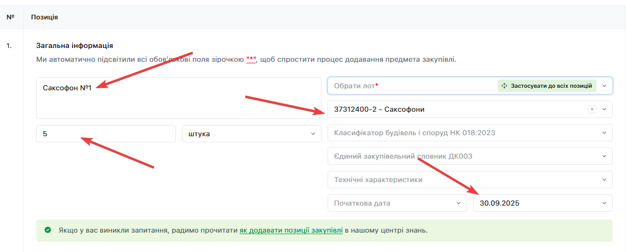 Заповніть необхідні поля інформацією щодо предмету закупівлі