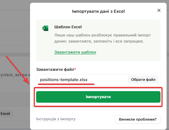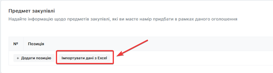 Щоб завантажити шаблон в закупівлю натисніть кнопку Імпортувати дані з Excel: