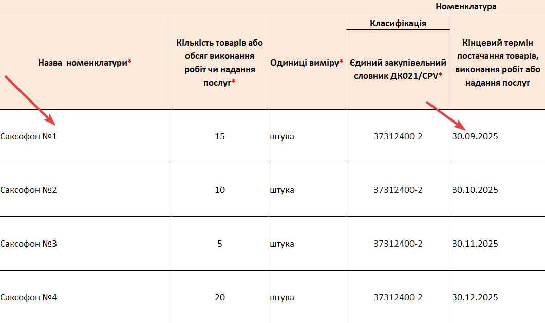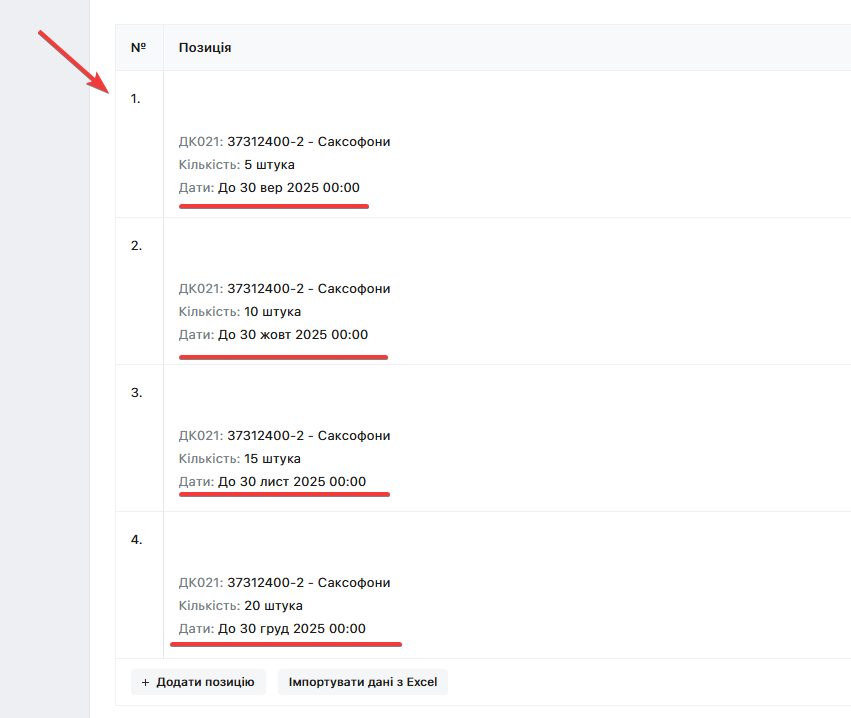 В разі успішного імпортування даних із шаблону - буде автоматично сформовано список із всім Предметами закупівлі: