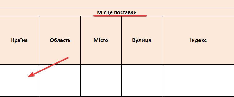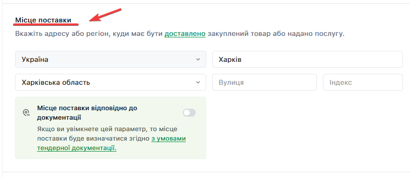 За потреби вкажіть Місце поставки, заповнивши відповідні поля: