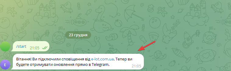 Бот відправить повідомлення про успішне підключення сповіщень: