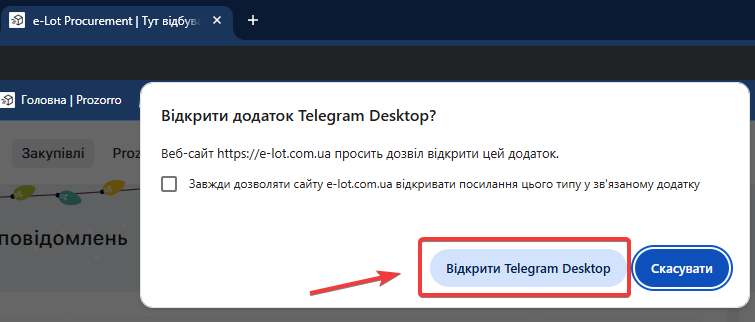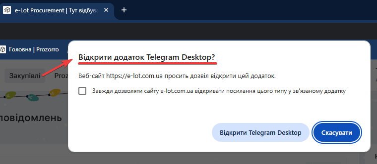 Після натискання з'явиться автоматичне повідомлення із проханням надати доступ сайту - відкрити додаток Telegram Desktop: